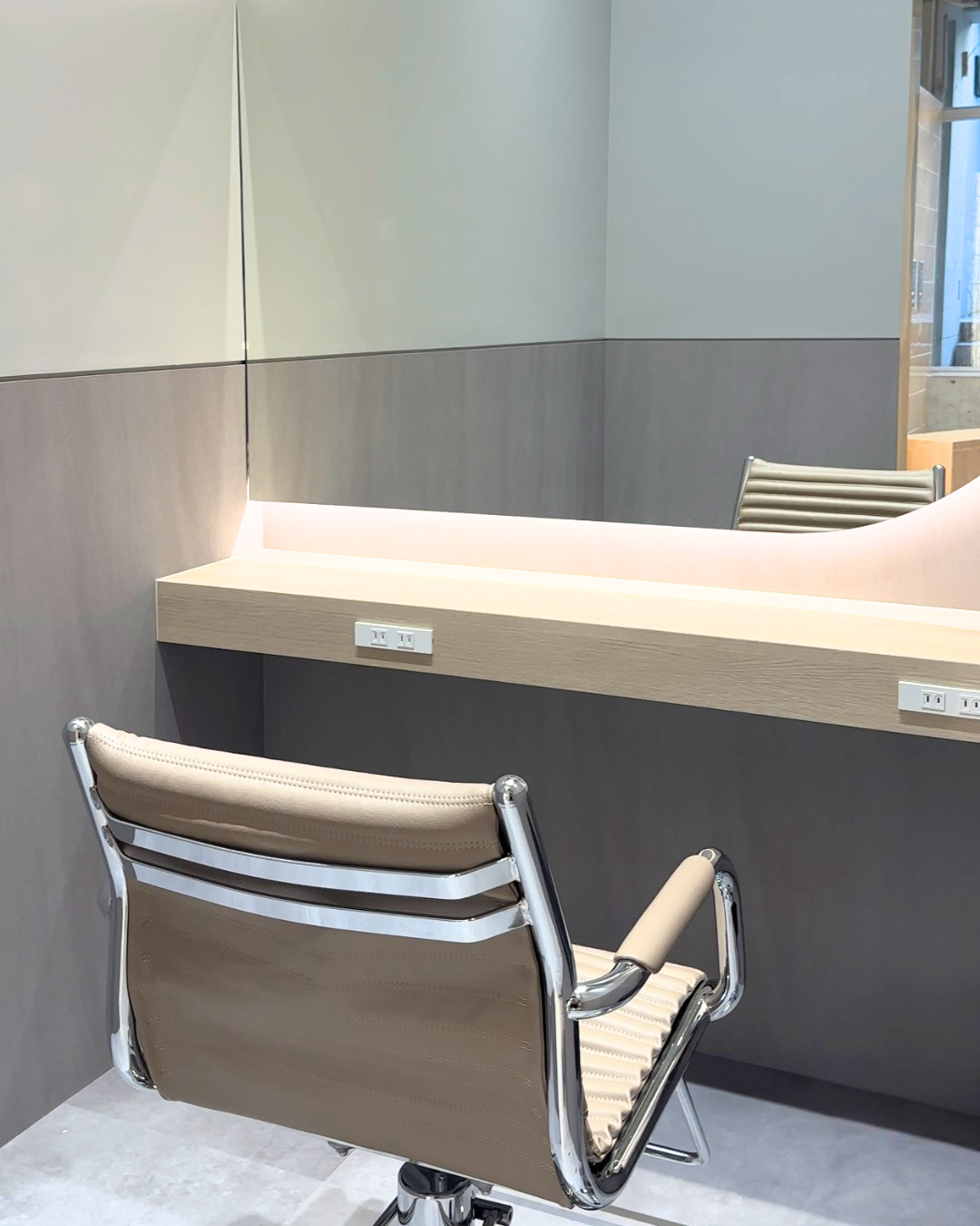 お客様がゆったりくつろげる広々とした空間になっております。鏡が近いのでメイクやパーソナルカラー診断にもおすすめの空間です。