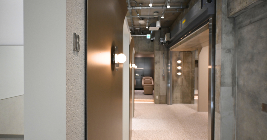 壁に埋め込まれた丸窓や浮遊感のある照明が、さりげない遊び心と高揚感を演出。